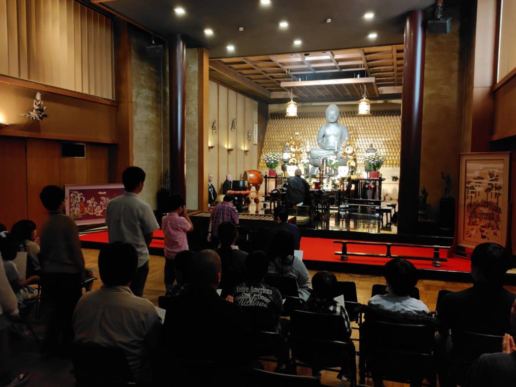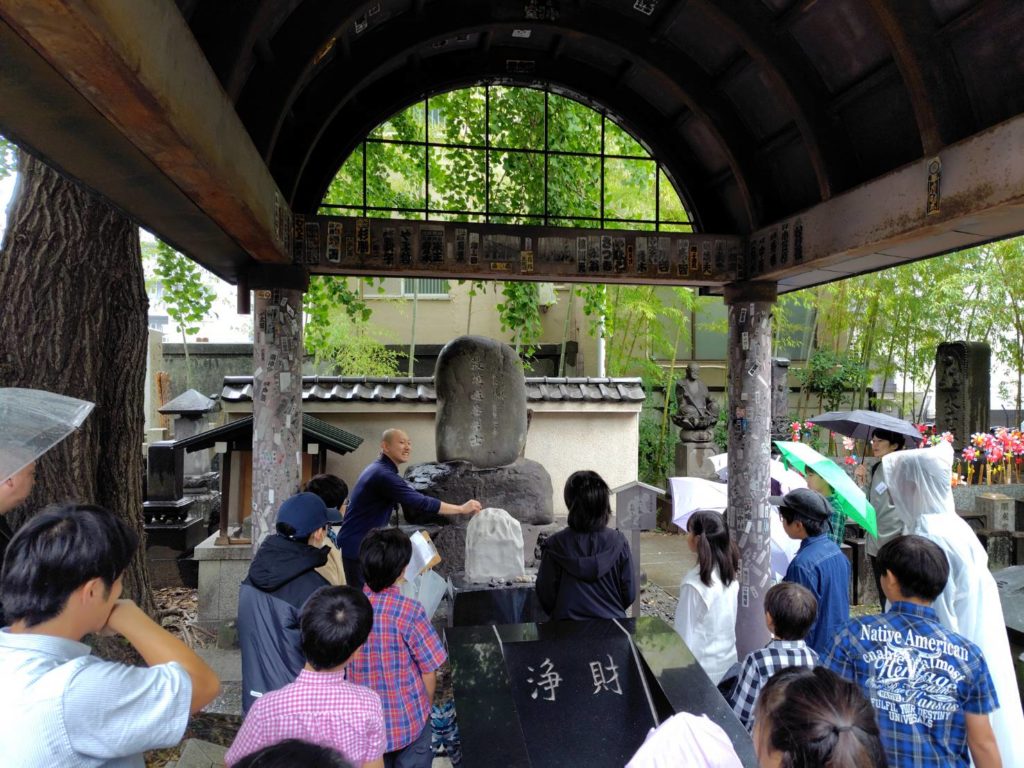午後は両国の回向院様を会処としてお借りしました。大型バスで移動後、昼食のお弁当をいただきました。その後、職員の方に説明をしていただきながら境内を参拝しました。特に鼠小僧のお墓ではお前立ちの墓石を子どもたちが一生懸命に削って、ご利益にあやかろうとする健気な姿を見ることができました。続いて念仏堂に戻り、ぬり仏をしました。阿弥陀様や法然上人など複数の絵から好きなものを選び、子どもたちが思い思いの色をつけました。最後に本堂をお借りして法要を行いました。子どもたちのぬり仏を仏前にお供えして、皆で太鼓にあわせて般若心経をお唱えしたのは印象的なシーンでした。